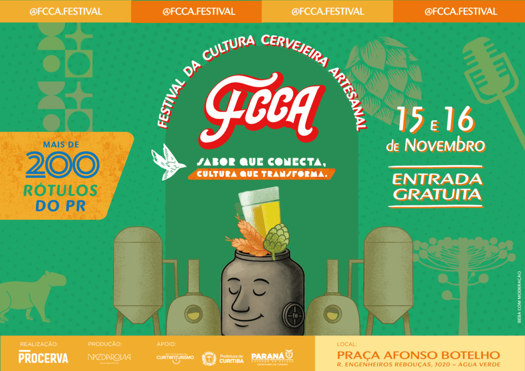 O sétimo FCCA – Festival da Cultura Cervejeira é uma realização da PROCERVA, com apoio da Secretaria de Turismo do Paraná e Instituto Municipal de Turismo. A organização é da Nazdarovia Eventos. Mais informações pela rede social oficial: Instagram | @fcca.festival.